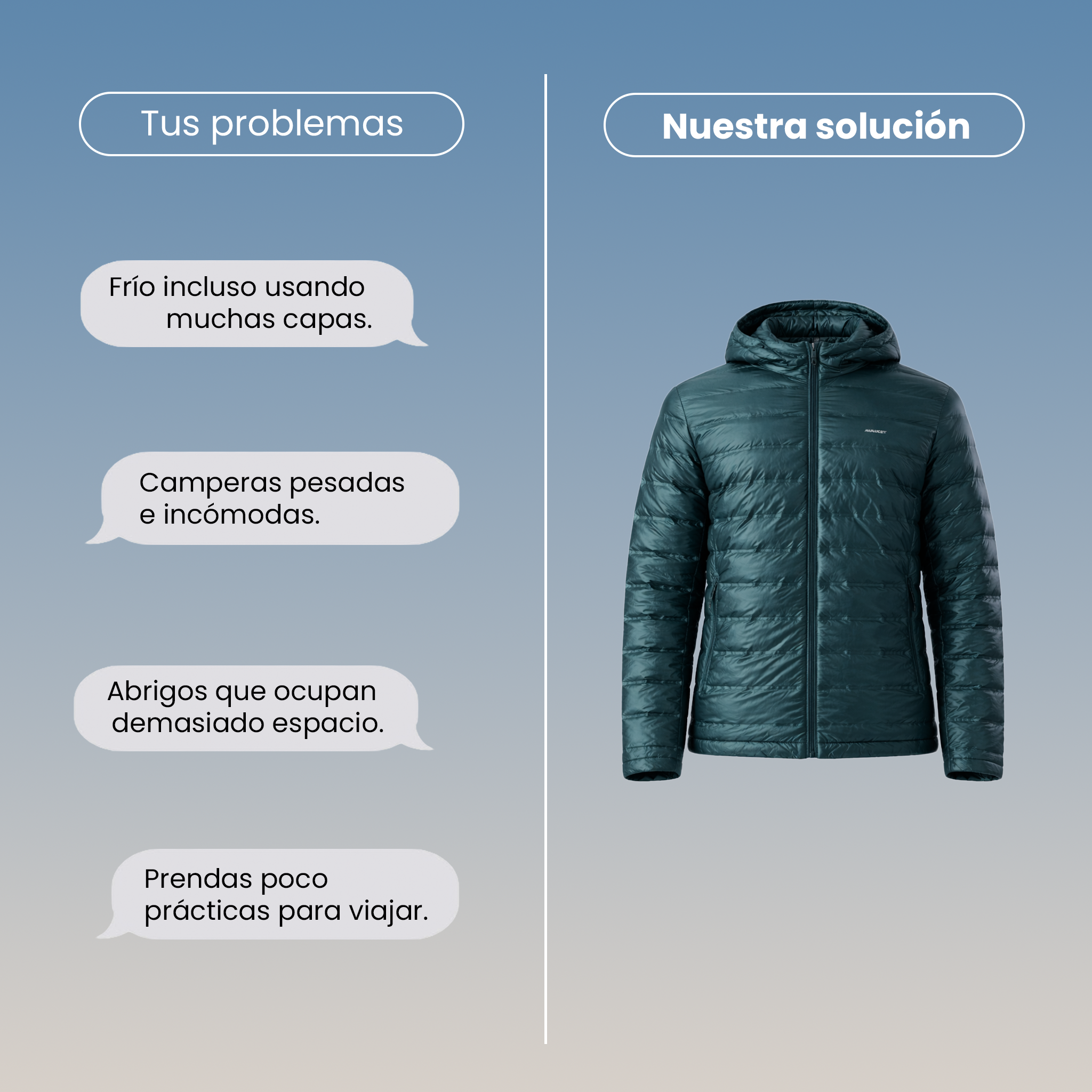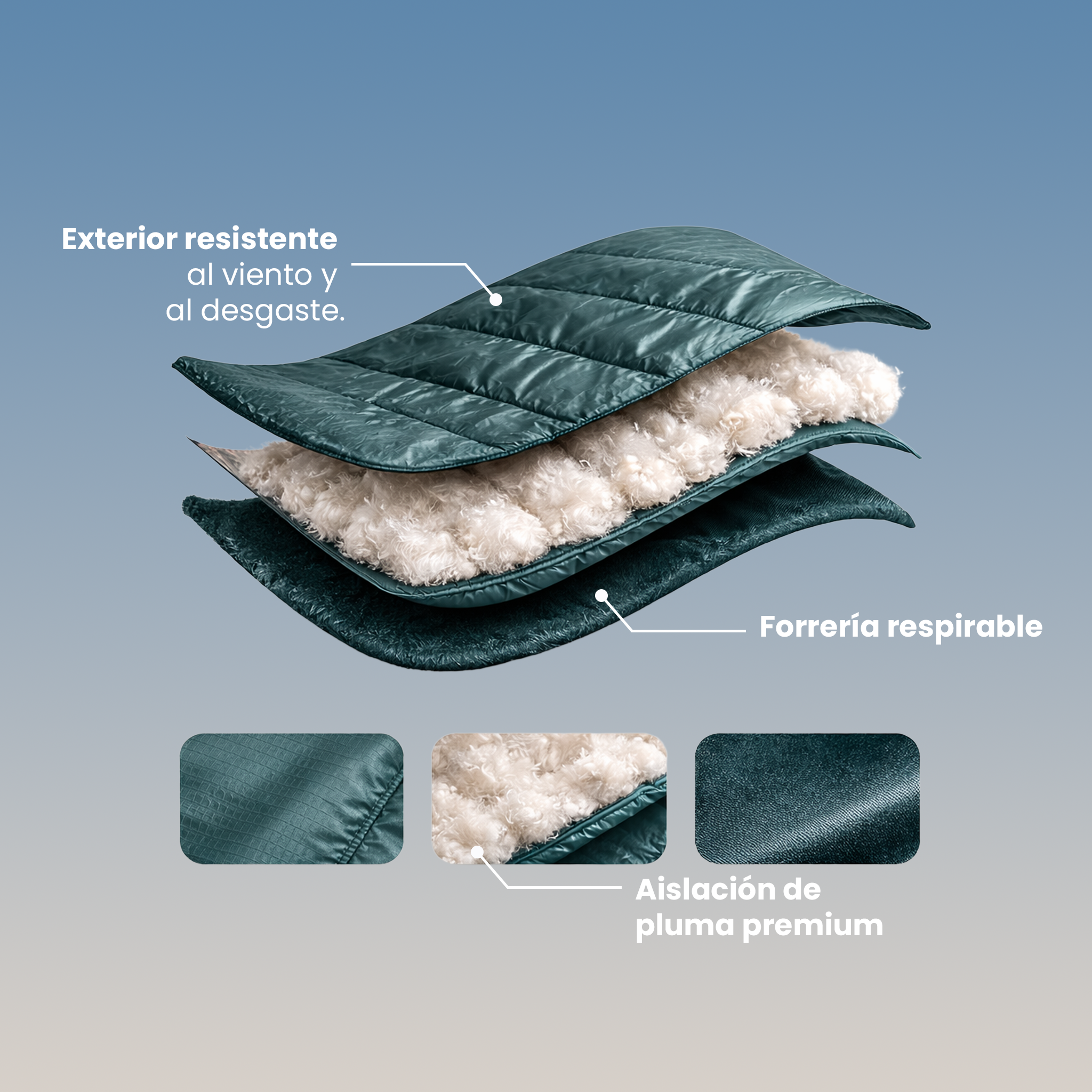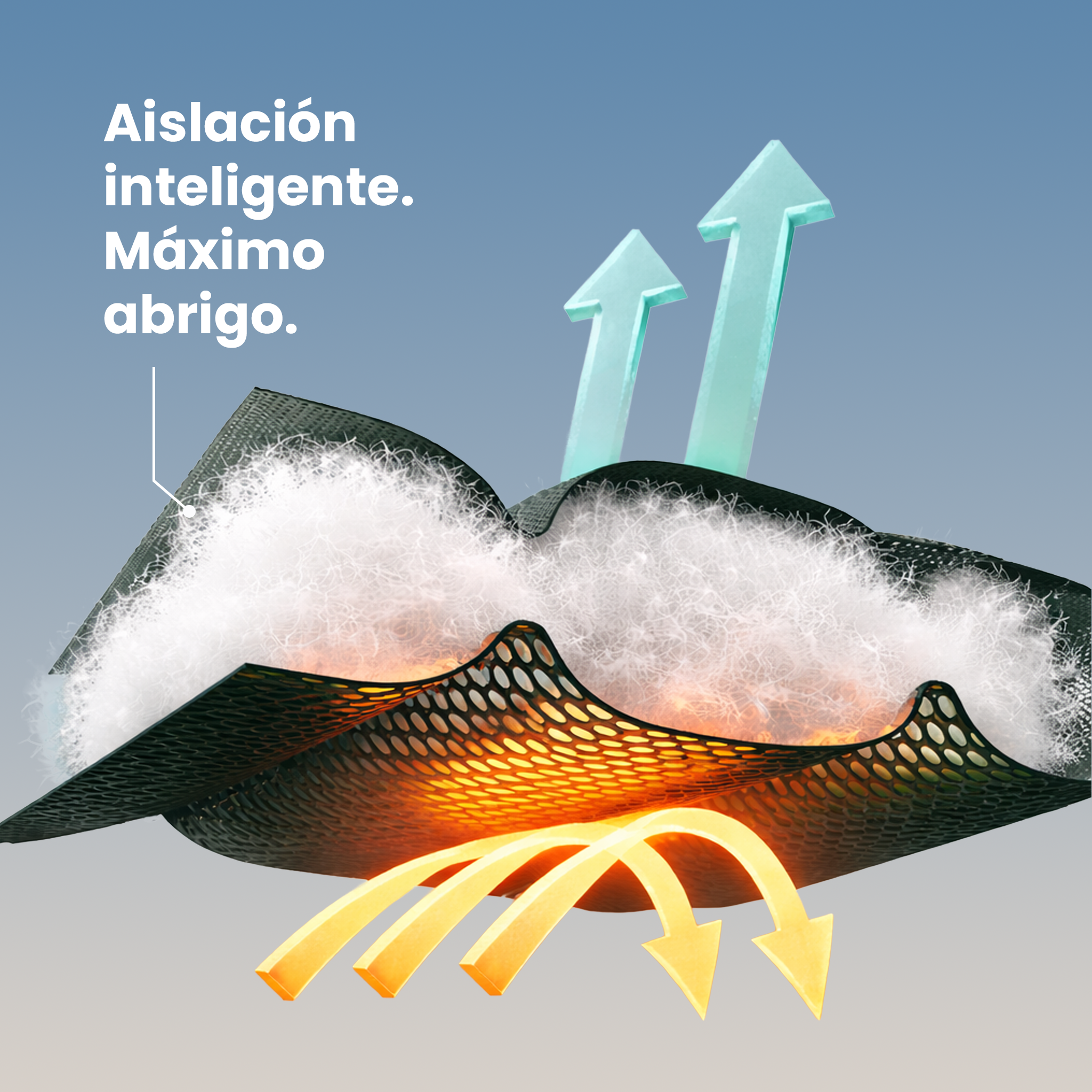 Diseño ultraliviano y compacto, pensado para retener el calor corporal sin generar peso ni volumen innecesario.