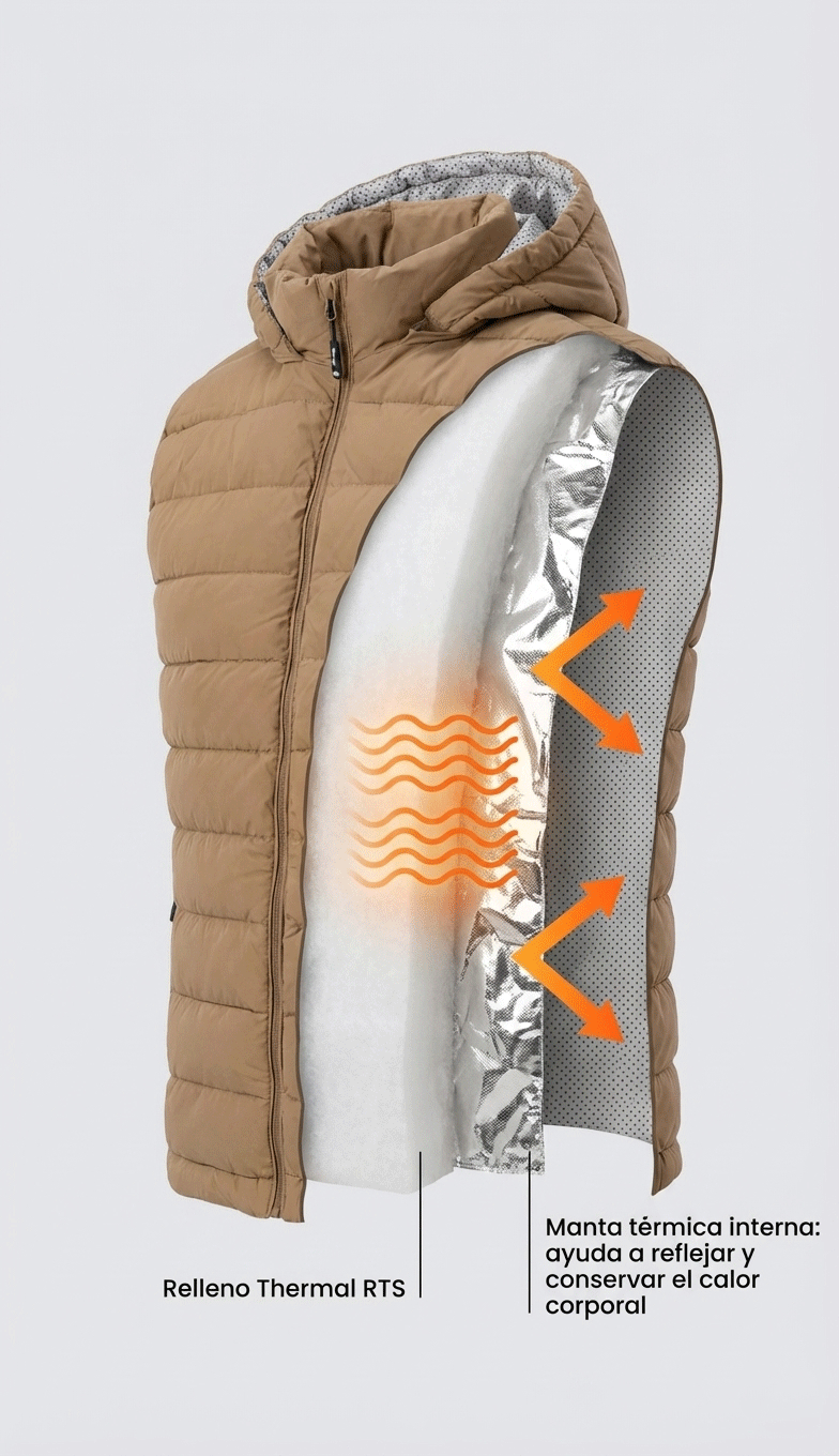 No. El relleno Thermal RTS es un material respirable, diseñado para conservar el calor corporal sin generar acumulación excesiva de humedad. Esto permite mantener una temperatura confortable y ayuda a evitar la transpiración durante el uso cotidiano o en movimiento moderado.