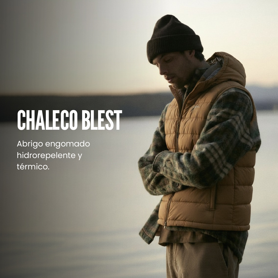 Confeccionado en tela engomada hidrorepelente, el Chaleco Blestl: